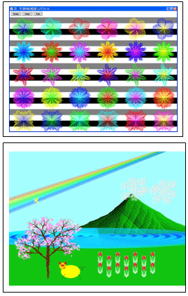 また、本年度数物科学科長である東海林まゆみ先生の講演は「卒業研究論題紹介・・・嫌われものの数学で人気者のドラえもんを描く」でした。CG作成のお話で、ドラえもんを描いたり、ミッフィーにある角度からスッポトライトを当てるとどのような状態に表現することが出来るかとか、自分のパソコンで楽しんで遊ぶことができると言うものでした。特に嬉しかったのは、中学・高校程度の数学で素敵な左記のようなCGを作ることができると言うことで、数学からはかなり遠のいている者にとっても大変興味を誘われる内容でした。今回は、同窓会の総会・懇親会の時間内での講演でしたので、例を示して頂いたのみでしたが、今後この講義を受けることが出来るようなチャンスを用意して欲しいと言う声も多数有り参加者各々に良い刺激となりました。