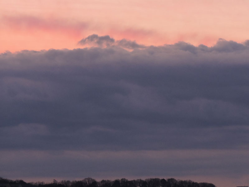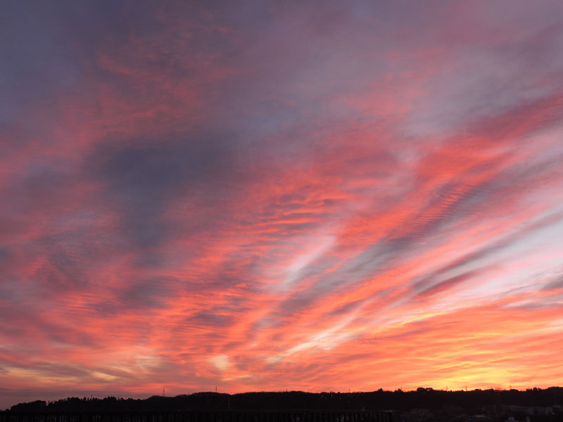 「響迫朝焼け雲」は、「響迫」というでたらめの変な漢字を使いましたが、赤い朝焼け雲が空に音楽的に鳴り響いて、こちらに近づき迫って来るような感じがしたからです。(このような朝焼け雲は、1年に何回か見られます。)