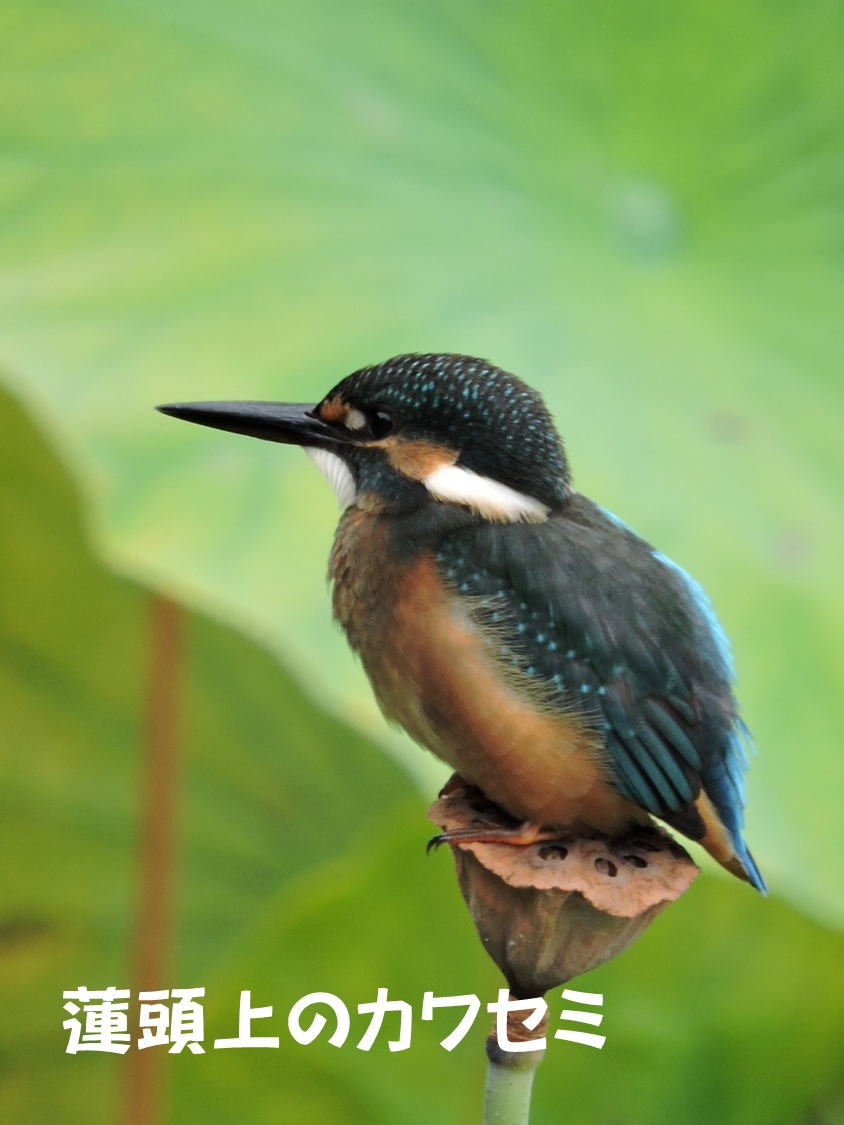 蓮の花が終わった後の花托の上に、ちょこんと乗っているカワセミ。